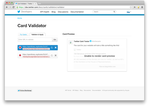 @twitterapi card validator is failing with internal error when validating http://openlibrary.org . screenshot attachedpic.twitter.com/aF8QEj2m4e