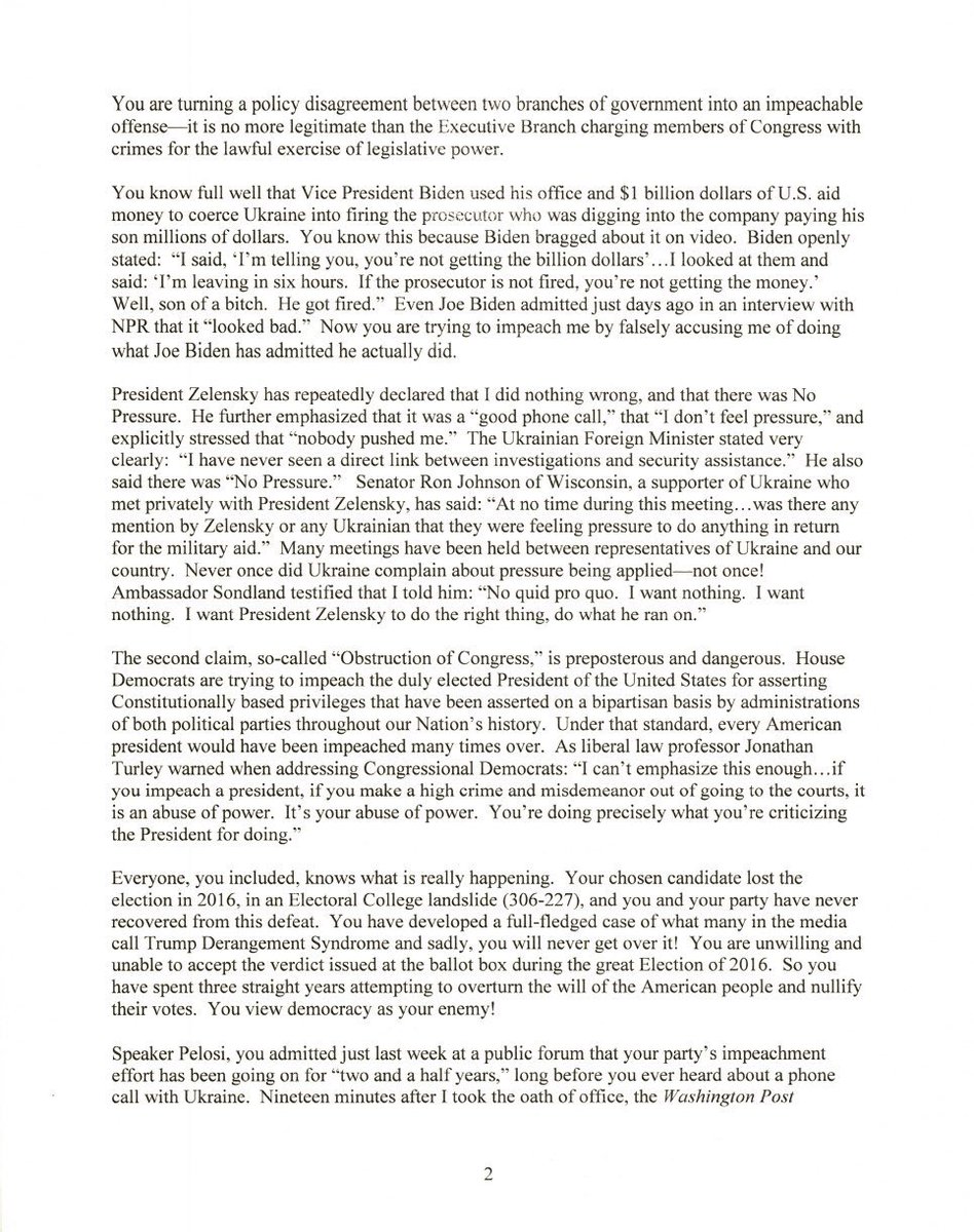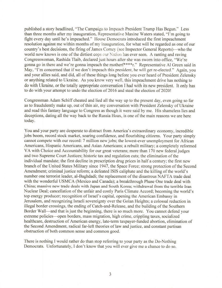 NEW: Trump sent a letter to Nancy Pelosi in which he complains about how “unfair” the “impeachment hoax” is & tells her she is offending the Founding Fathers and “declaring war on American democracy”:
