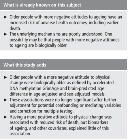 A new LBC1936 study finds limited evidence that people with more positive attitudes to ageing are biologically younger as defined by leucocyte telomere length, DNA methylation age and brain-predicted age difference: https://edin.ac/2Uugm7M