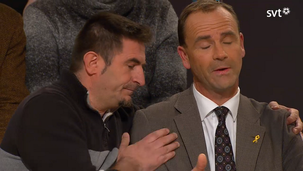 I dag blev Allan Widman kramad av en famös strippklubbägare i live-teve.