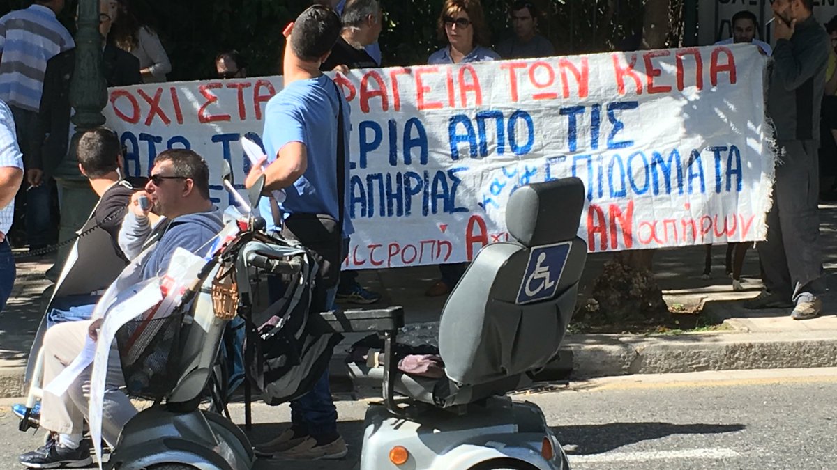 Tredje demonstrationen sen igår i Aten. Blev inte utsläppt från premiärministerns kansli, en demonstration av rullstolsburna blockerade.pic.twitter.com/nAbnauDclj