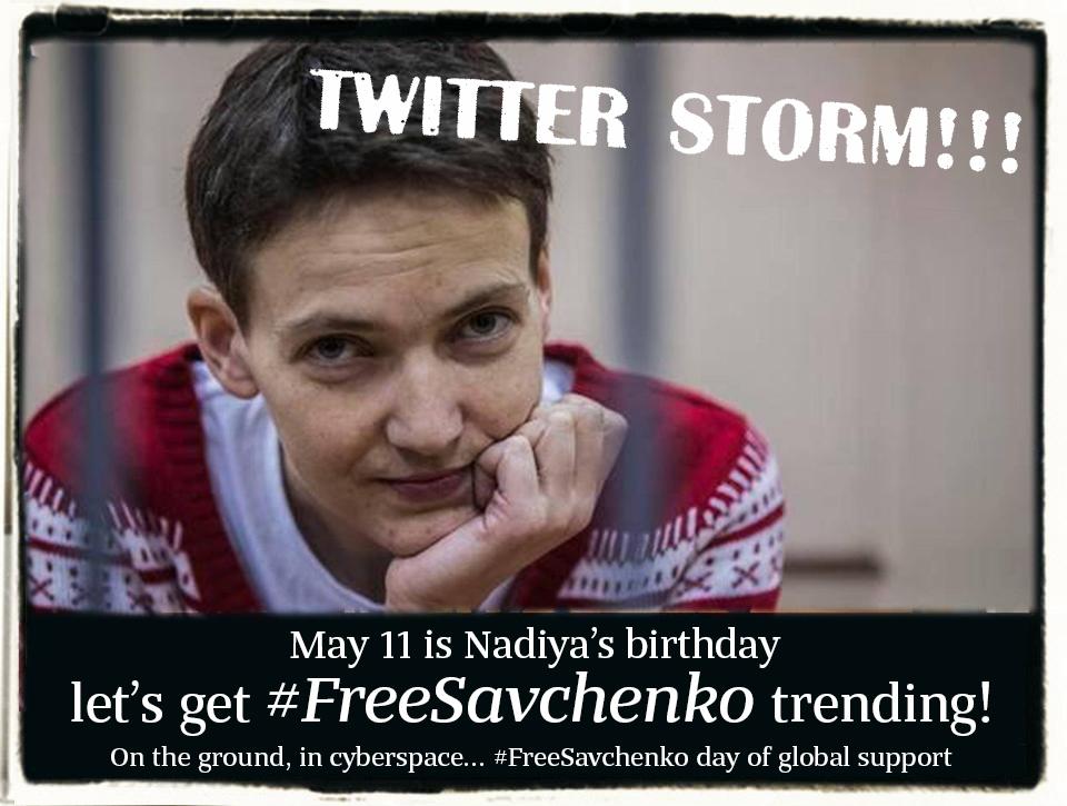 Twitter storm!! On Nadiya's birthday, May 11, let's make #FreeSavchenko trending https://www.facebook.com/events/930788396943395/?ref=98 … pic.twitter.com/q01X5xulIn