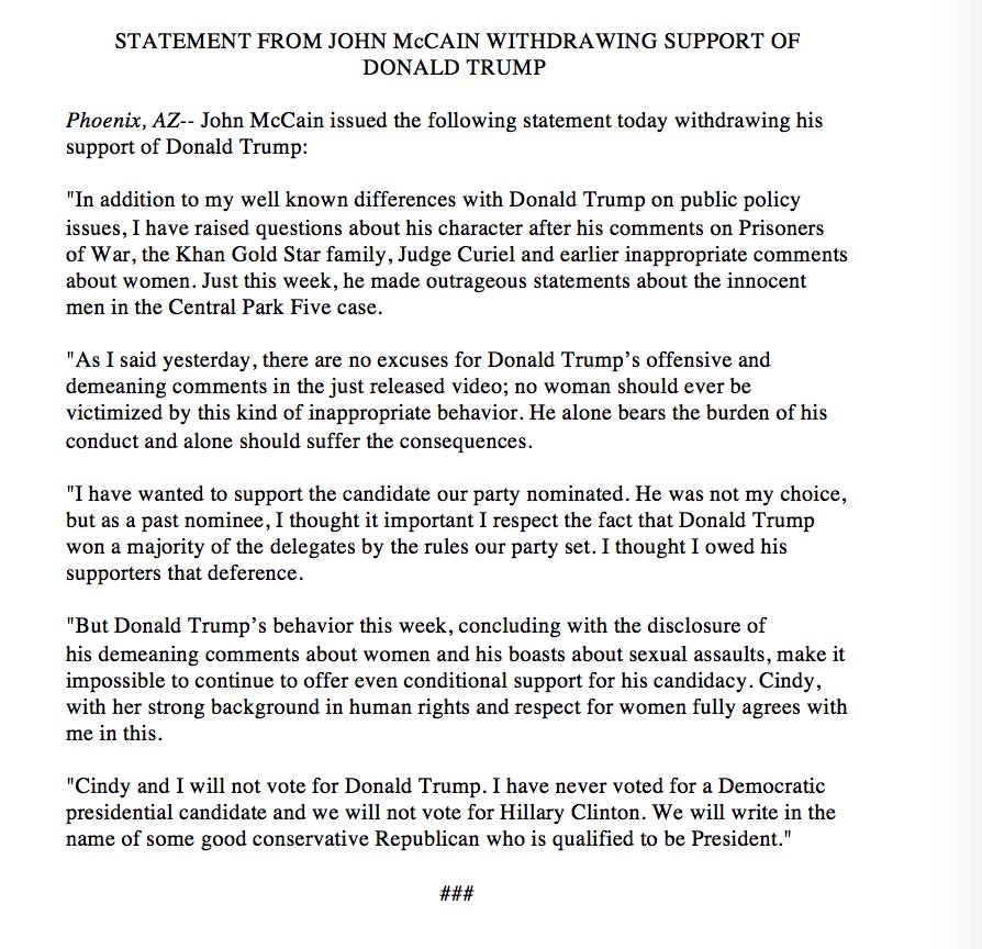 Full Statement by John McCain -- "We will write in the name of some good conservative Republican who is qualified to be President." pic.twitter.com/h5vH5vkrBP