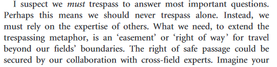 One interesting aspect is hybridizing questions, that are "addressed and answered by combining evidence and techniques from two or more fields". Here one either needs to trespass or work in interdisciplinary teams.pic.twitter.com/6WF85gdb8d