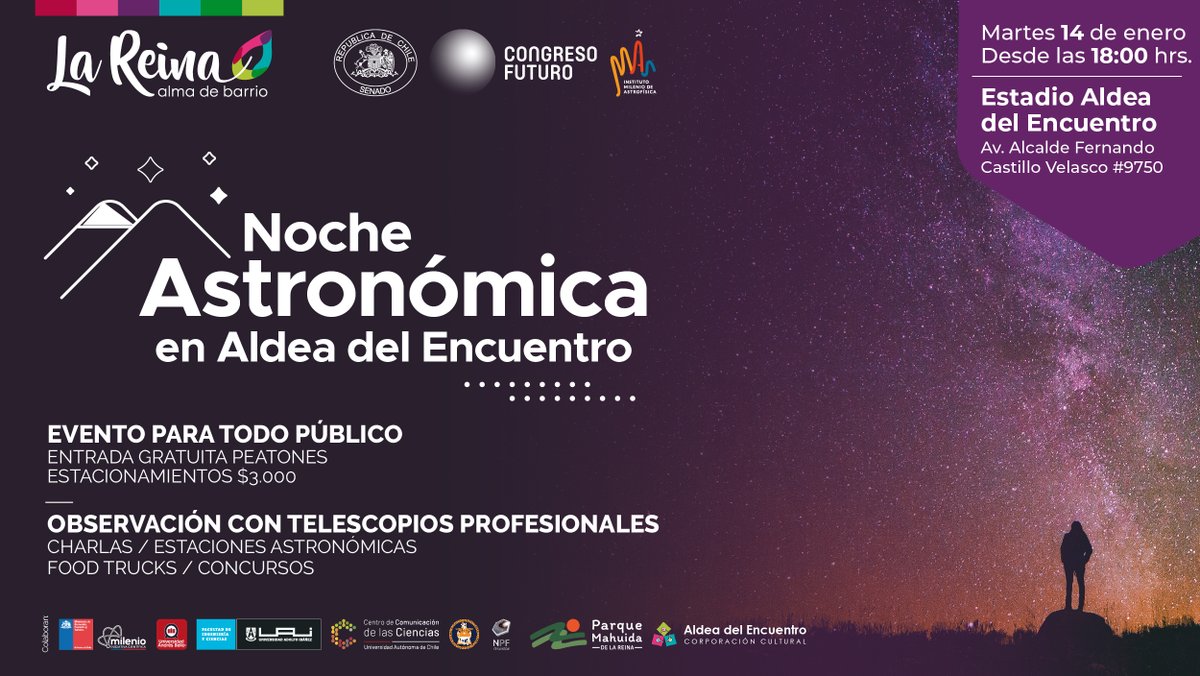 #NocheDeObservación junto a@MuniLaReina y@congresofuturo Telescopios, concursos, te enseñaremos a armar tu telescopios y la charla de nuestra subdirectora@mzoccali Y muchísimo más!https://twitter.com/MuniLaReina/status/1214907386558918656 …