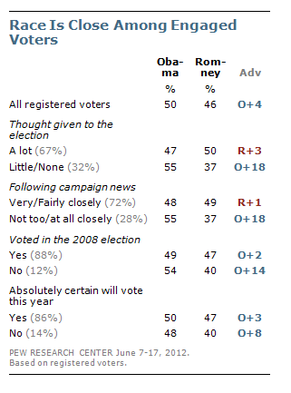 RT @pewresearch: Obama leads Romney 50-46 among all voters http://pewrsr.ch/Myfovd Romney leads 50-47 among engaged voterspic.twitter.com/8RxI0wLI