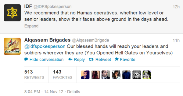 This is what war looks like on Twitter http://mashable.com/2012/11/14/isreal-gaza-strike-twitter/ … cc @IDFSpokesperson @AlqassamBrigade pic.twitter.com/lPdt1SfU HT @Twiplomacy