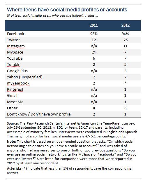 94% of teen #socialmedia users are on FB, 26% on Twitter, 11% on Instagram http://pewrsr.ch/191zI4V pic.twitter.com/8NkkzNUPvC v @pewresearch
