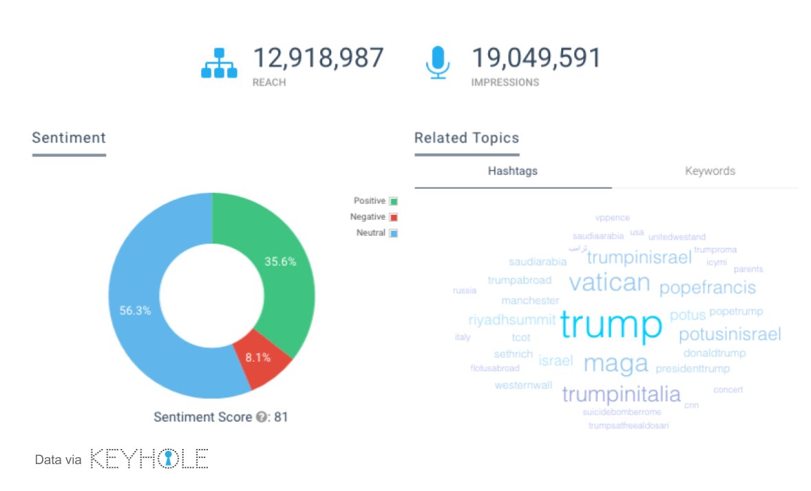 In the past 24h, hashtag #POTUSAbroad reached 13mil people, 20mil impressions. Overall neutral sentiment. #digitaldiplomacy #trumpinitaliapic.twitter.com/0WBctAoaej