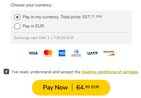 When an airline inverts the exchange rate, you start to wonder what else they might have inverted. The real exchange rate is 1 DKK = 0.13 EUR