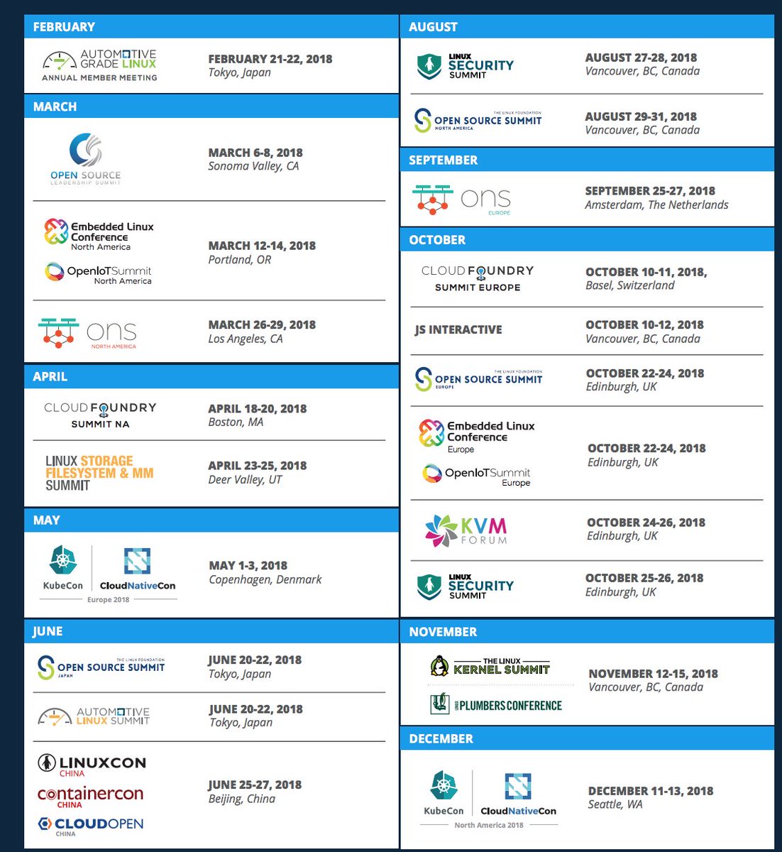 The Linux Foundation's 2018 Global Schedule of Events #Linuxpic.twitter.com/3pGwJKnbTp