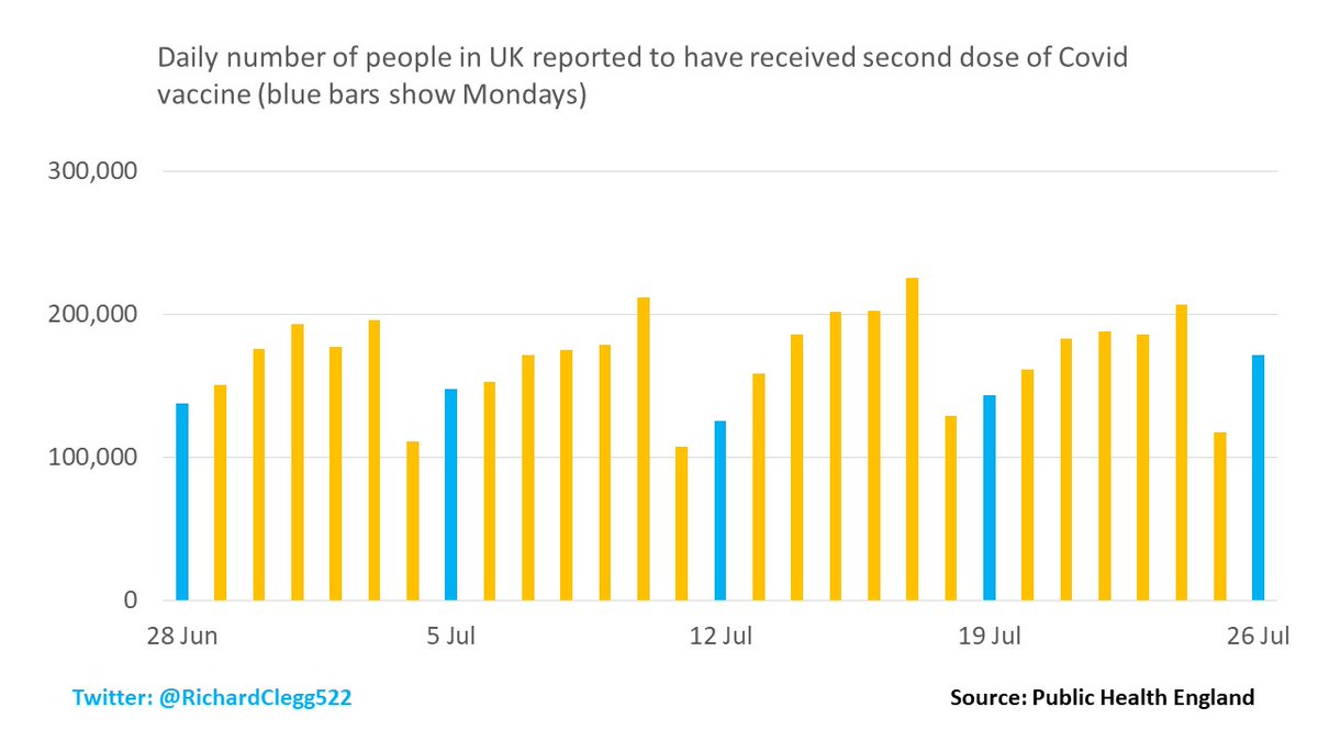 Today's vaccination figures are showing higher 1st and 2nd doses than a week earlier. It could be a one off data blip or maybe the first sign of vaccine passports encouraging higher uptake of the vaccine.https://twitter.com/RichardClegg522/status/1420009846317912072?s=19 …