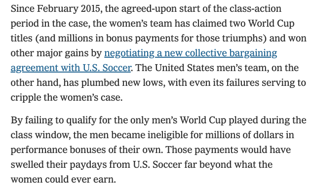 So basically the USWNT's equal pay lawsuit failed because the men are bad at soccer https://www.nytimes.com/2020/05/02/sports/soccer/uswnt-equal-pay-women-soccer.html …pic.twitter.com/iHH89SXA1X