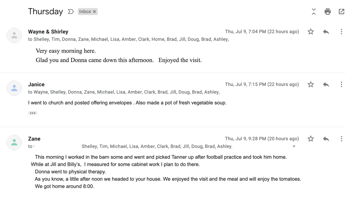 I get a lot of email from people I don't know that's meant for other Andrew Helms' but this is the most soothing one of all time. The subject line is "Thursday" and people just replied with what they did that day like make vegetable soup or pick Tanner up from football practicepic.twitter.com/RdyU0VcKfN