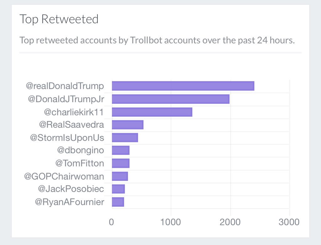 Today’s top 5 retweeted accounts by bots: 1) @realDonaldTrump 2) @DonaldJTrumpJr 3) @charliekirk11 4) @RealSaavedra 5) @StormIsUponUs @JackPosobiec is climbing up the charts! But can he rank higher than @TomFitton?? TUNE IN TOMORROW! 🇺🇸🔥🤖#botnationpic.twitter.com/pByyWcB7SV