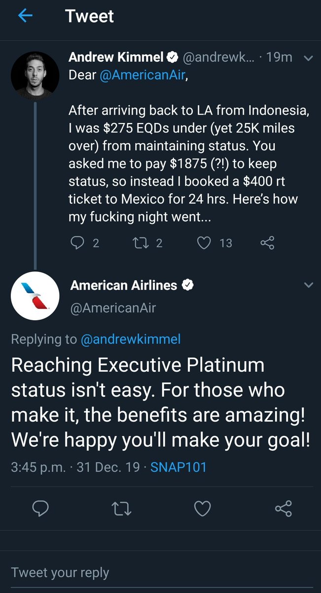 Lol thanks. The point I was making is that none of this would’ve happened if AA would’ve just let me pay the $275 I was short as they used to allow... not the made up $1875 which came out of their asses. Each year brings new greedy provisions that fucks the customers.