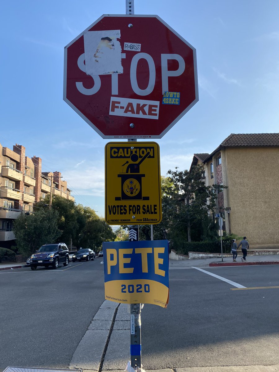 Friendly caution sign by @GBAuerbach spotted at the bottom of Runyon Canyon. Interesting placement for a Buttigieg poster.pic.twitter.com/wErLX8WIYS