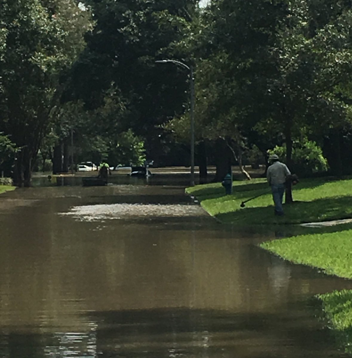 It was bizarre to see landscapers out in the Bunker Hill neighborhood today as cars floated down the street. #Harvey #Houstonpic.twitter.com/zXWOiI42va