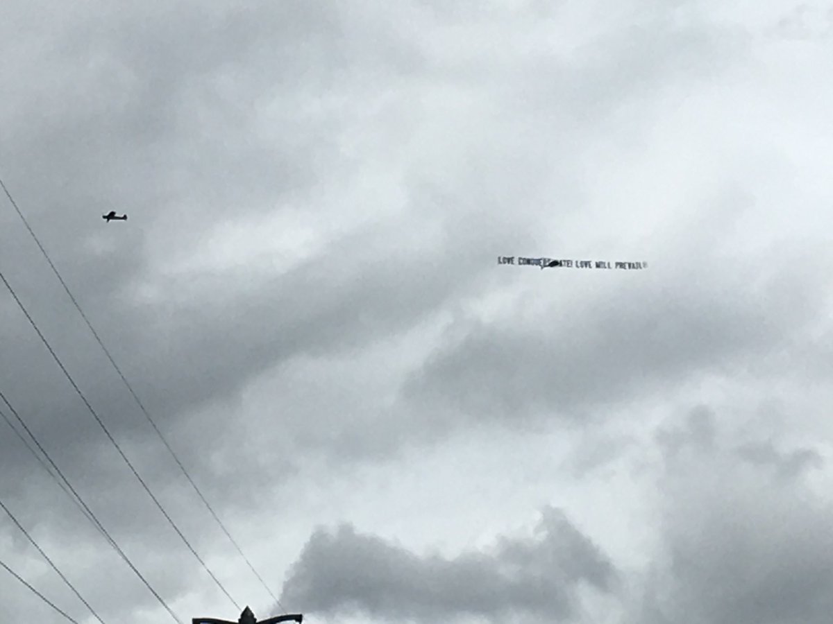 Plane flying a banner overhead that says, “Love conquers hate! Love will prevail!” #SpenceratUFpic.twitter.com/AaFGpGmmvf