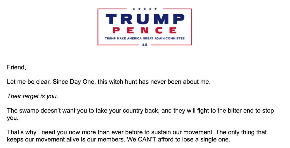 In an email seeking donations, the #MAGA Committee and #RNC write that the "witch hunt" is not about @realDonaldTrump, but that you the voter are the target.pic.twitter.com/yyWjXmXHiI