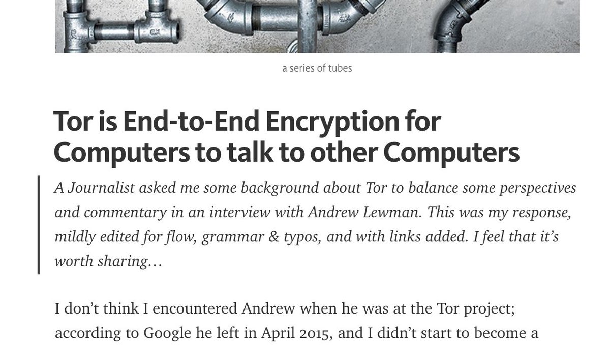 NEW: "Tor is End-to-End Encryption for Computers to talk to other Computers" https://medium.com/@alecmuffett/tor-is-end-to-end-encryption-for-computers-to-talk-to-other-computers-34e41d81c9e2 … /cc