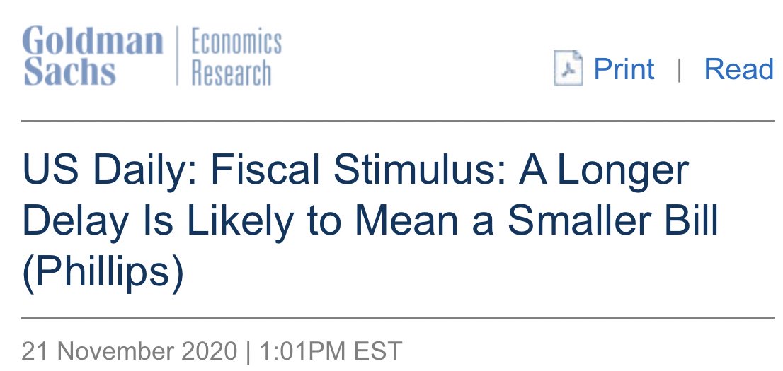 GOLDMAN: “The longer Congress waits to pass further fiscal measures, the smaller the bill is likely to get,” as the vaccine outlook “will restrain the amount of fiscal support Congress will want to provide.” We now expect Congress “to approve $700b .. vs. $1 trillion previously.”pic.twitter.com/TGBrk4PYLj