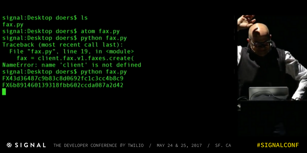 @jeffiel's morning: Live code in front of 2,000 people Ring 20 fax machines#signalconf is live! Tune in: http://twilio.com pic.twitter.com/dNj7oc7iNW