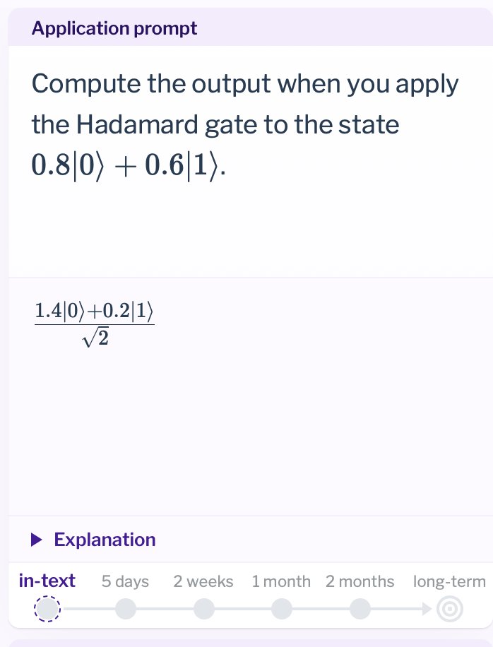 In "Quantum mechanics distilled," @michael_nielsen and I introduce application prompts, which have you use what you've learned to solve a problem. You won't be able to answer from memory but they're light enough to solve in your head. https://quantum.country/qm