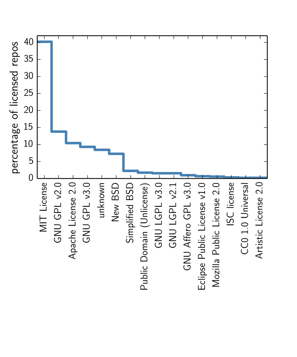 Of the 1.6M randomly chosen repos that I've downloaded off , only 15% have licenses & here's the distribution: Re RT: Why *is* is the MIT license so much more popular than BSD? They seem to be the same but the MIT is vaguer. Note: I actually use the MIT license for my own projects and not the BSD. I have no idea why I do this. I just do. Shorter? I use MIT over BSD for the same reason. :/