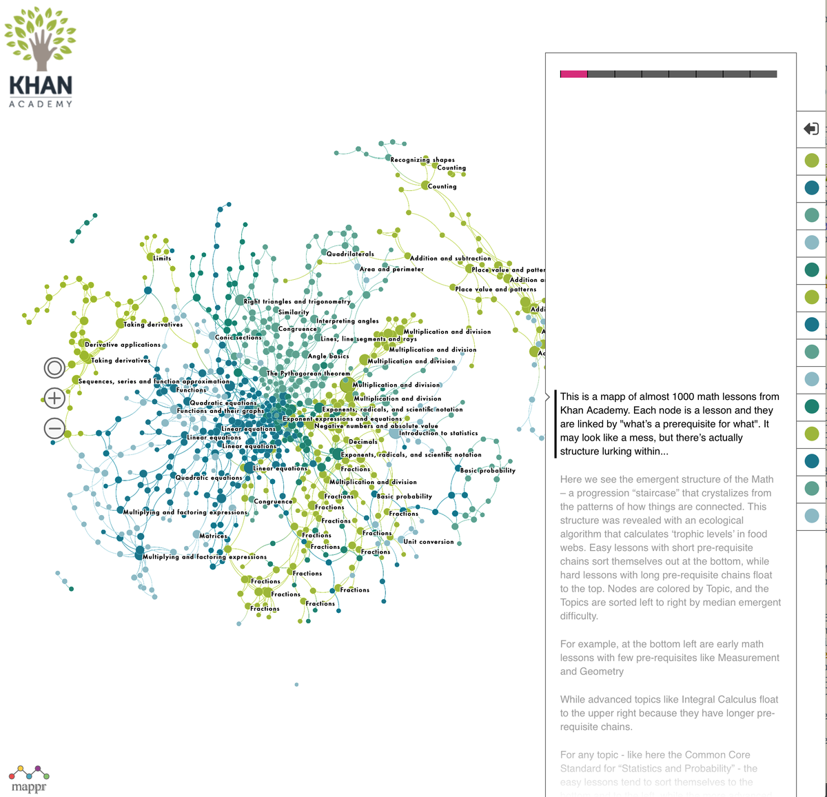 Impressive interactive map of Khan Academy's math curriculum shows emergent topic structure: beta.mappr.io/play/khan