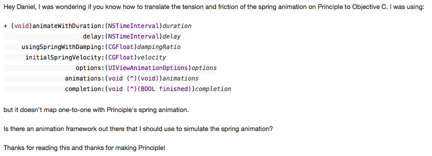 Andy Matuschak@andy_matuschakReplying to @danielchooper@danielchooper “use CASpringAnimation”4:29 PM · Feb 3, 2016 from Lower Haight, San Francisco·Tweetbot for iΟS1 Like
