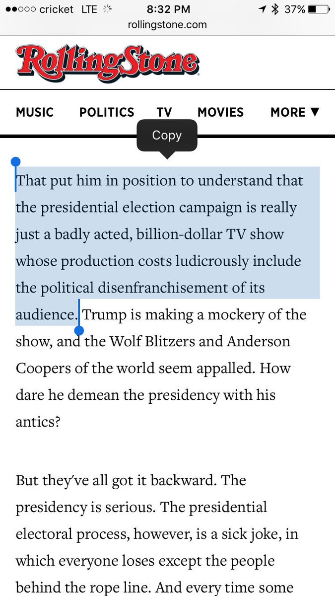 Matt Wahl@wahlยทFeb 26, 2016Terrifying. How America Made Donald Trump Unstoppable | Rolling Stone https://rollingstone.com/politics/news/how-america-made-donald-trump-unstoppable-20160224?page=13โฆ3