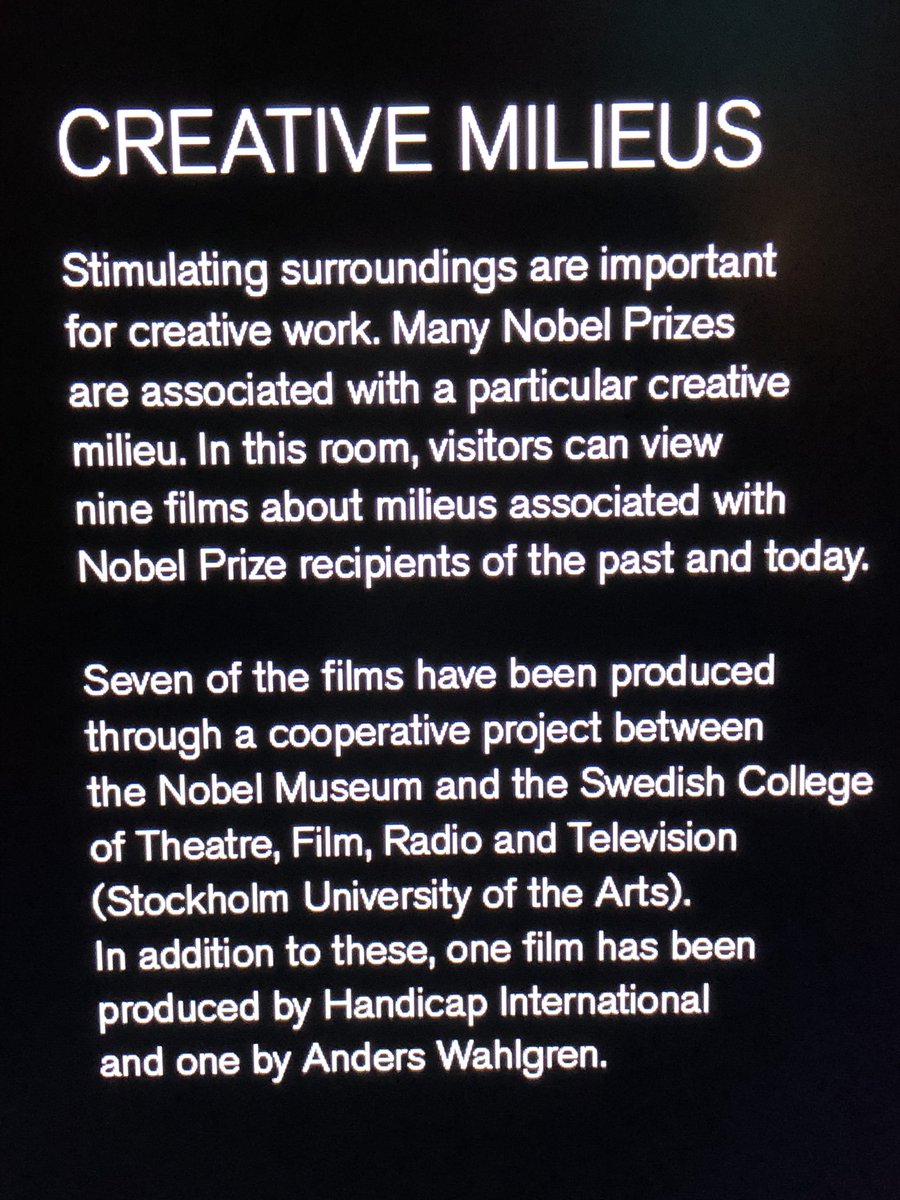 Interesting little films on places of scenius at the Nobel museum in Stockholm. Space, calm, freedom, high interpersonal standards were common themes.pic.twitter.com/zS6rCeSTLe