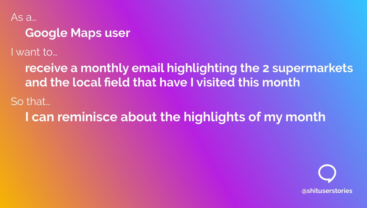 As a... – Google Maps user I want to... – receive a monthly email highlighting the 2 supermarkets and the local field that have I visited this month So that... – I can reminisce about the highlights of my monthpic.twitter.com/Bb2ko4e6Wr
