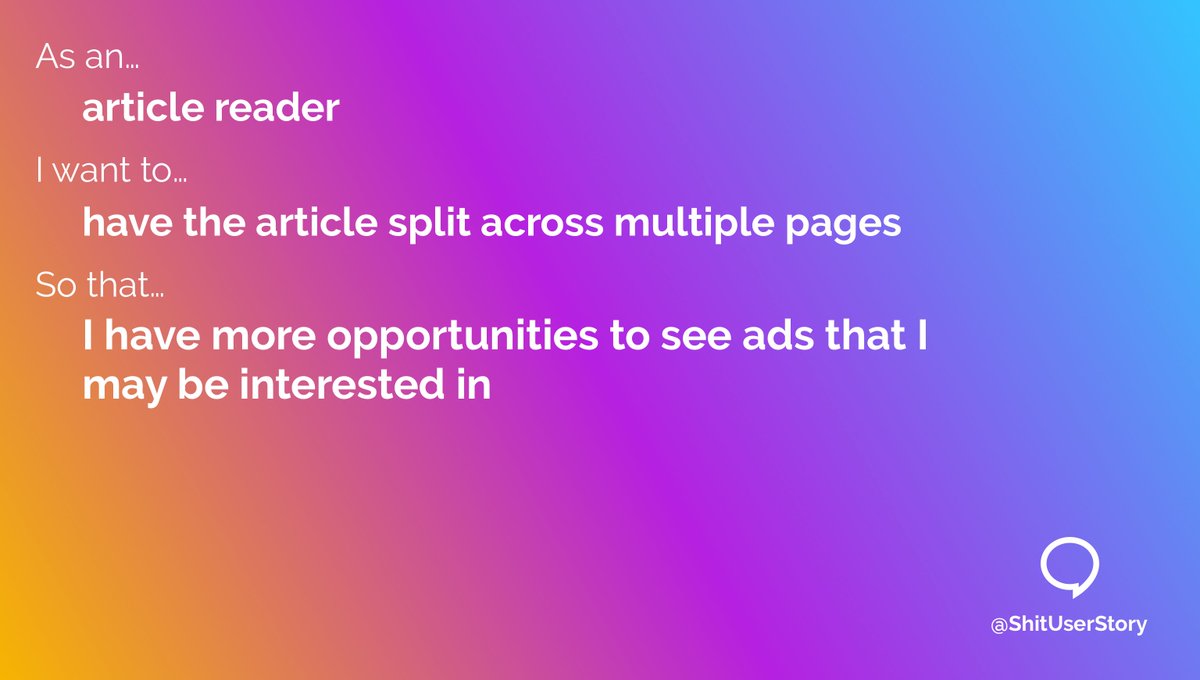 As an... – article reader I want to... – have news articles split across multiple pages So that... – I have more opportunities to see ads that I may be interested inpic.twitter.com/SCjS5TkEm1