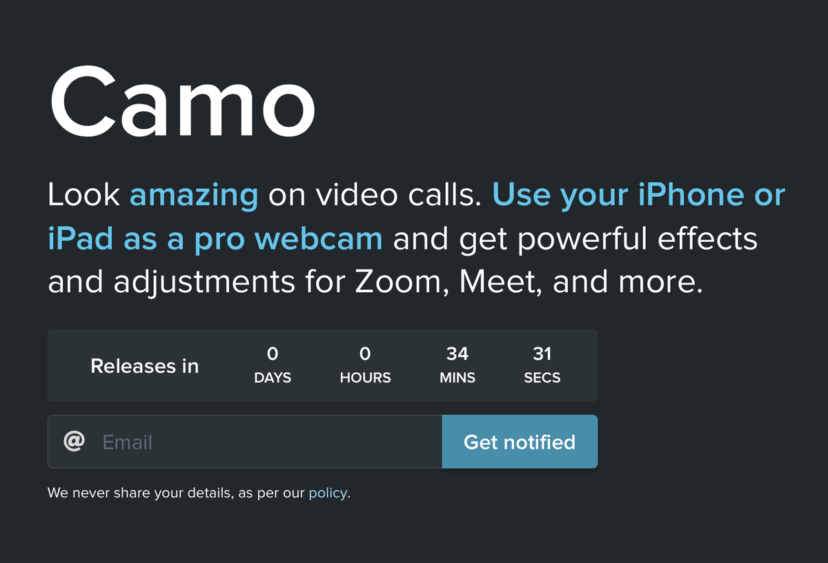 OK Twitter. Camo, our app for using your iPhone as a pro-quality webcam is shipping Thursday.