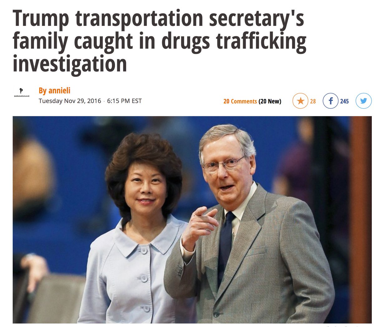 Sen. McConnell's father-in-law owns cargo ship that got busted w/90 lbs of cocaine Mitch's wife=Trump Transport Sec Elaine Chao