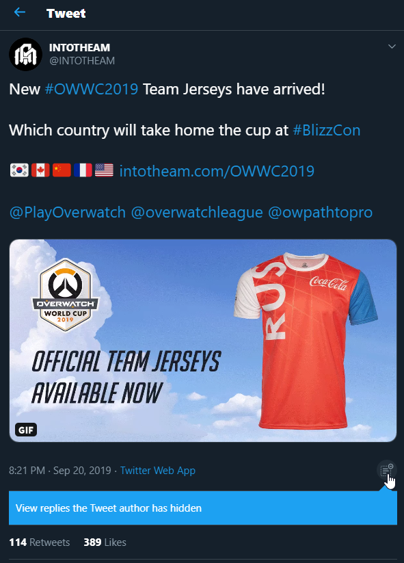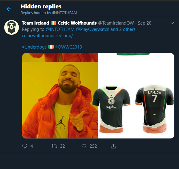 .@INTOTHEAM It doesn't feel like you guys "encourage others to express themselves through design, whether it be a competing product or genius-level spidey meme. <3" when you hide only the @TeamIrelandOW post and no other posts. #Underdogs 🇮🇪 #OWWC2019pic.twitter.com/YIoElJvNgV