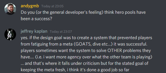 Jeff Kaplan's thoughts on if hero pools were a success from today's lightning round in the OW Creators discordpic.twitter.com/D322X5YKxn
