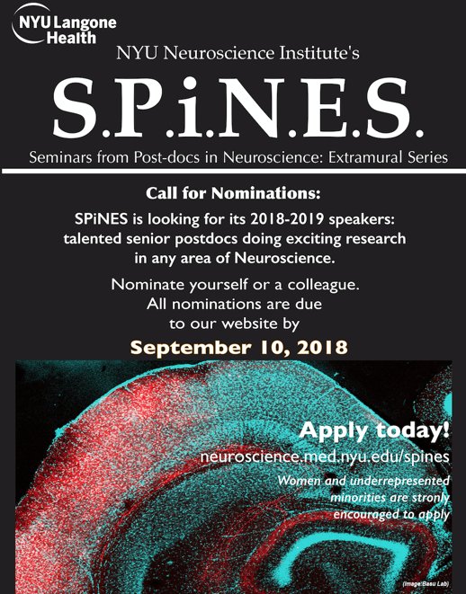 Hi all! Are you a postdoc with a good neuroscience story to share? Come tell the NYU neuroscience community about it this year. Nominate yourself or a colleague by September 10 here: https://med.nyu.edu/neuroscience/spines … Please RT & share with those not on twitter (I know, I know!)pic.twitter.com/31DZOpUAJU