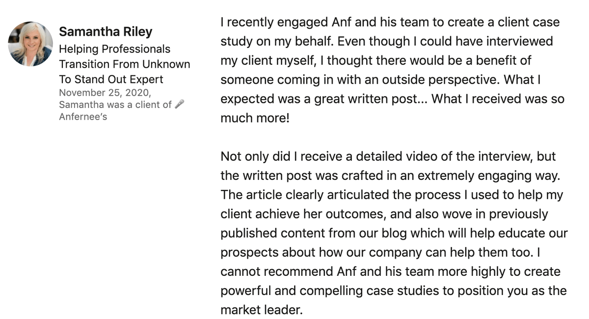 Here's what one of our clients Sam Riley recently shared about her experience working with us. Want help with producing compelling client case studies for your business too? Learn more