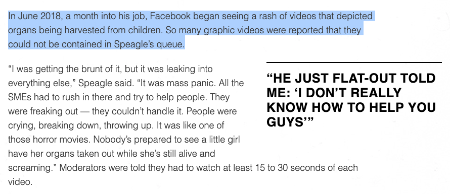 Today, three former Facebook content moderators are going on the record to talk about working conditions at their site in Tampa, FL. Their office was filthy, and their work was grim. Last year, a moderator had a heart attack at his desk and diedhttps://www.theverge.com/2019/6/19/18681845/facebook-moderator-interviews-video-trauma-ptsd-cognizant-tampa?utm_campaign=theverge&utm_content=chorus&utm_medium=social&utm_source=twitter …