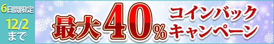 【本日(12/2)まで】お得な「最大40%コインバックキャンペーン」開催中! 期間中、お買い上げ額の合計に応じて、最大で40%のコインをプレゼント! (例:期間中、合計で10,000円分購入すると、4,000コインプレゼント!) http://bit.ly/37SmwTP この機会をお見逃しなく!pic.twitter.com/71FjKNUUFB