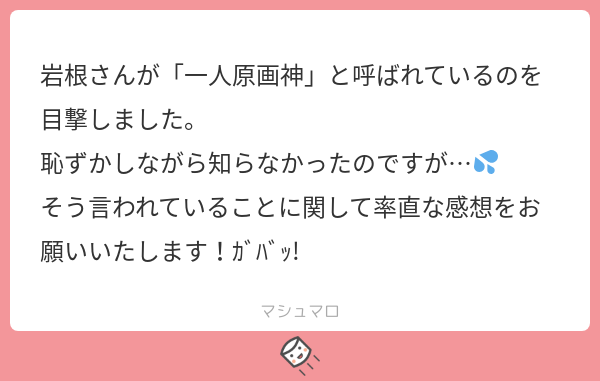 一人原画神! 私もまとめサイトで神とよばれてるのをたまたま見かけて、岩根さんを知りました!凄い頻度で絵をあげてらっしゃるので毎日イラストを拝見しては癒されてます。