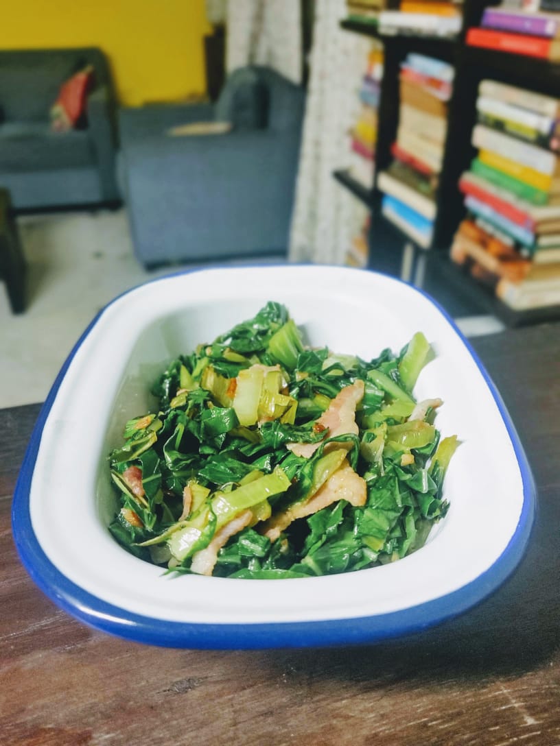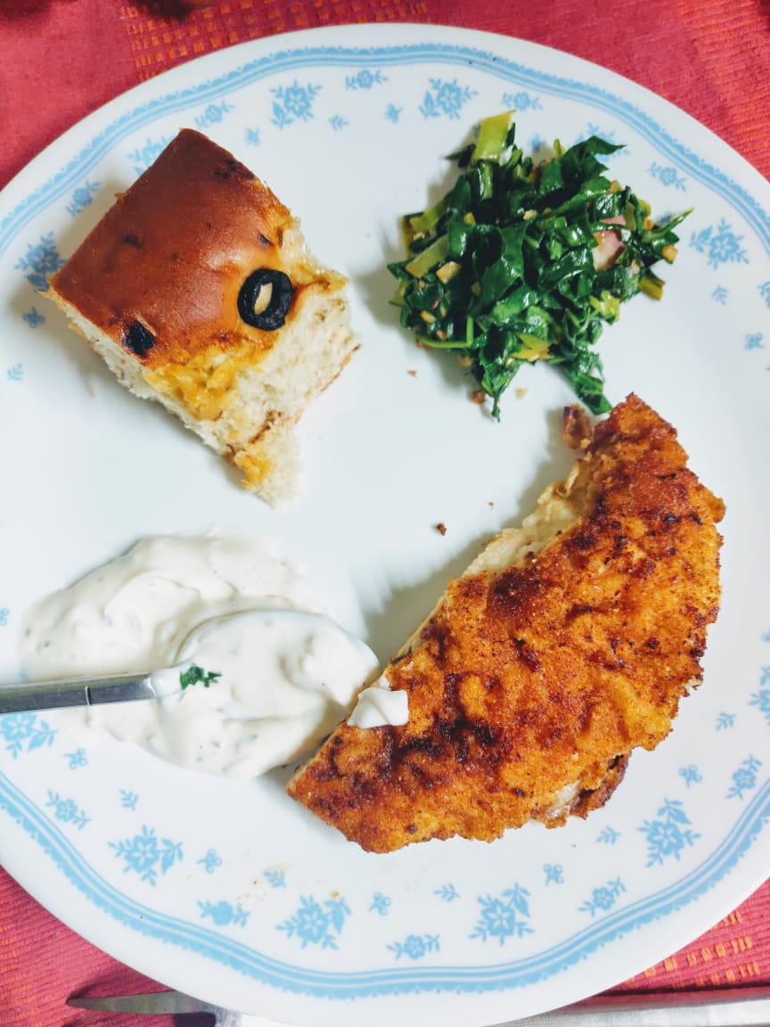 All tweeting about Bengali veg food made me hungry and gobbled this Chicken schnitzel with tartare sauce, olive crusted bread and some stir fried collard greens with bacon. The salad had loon salt as flavouring which