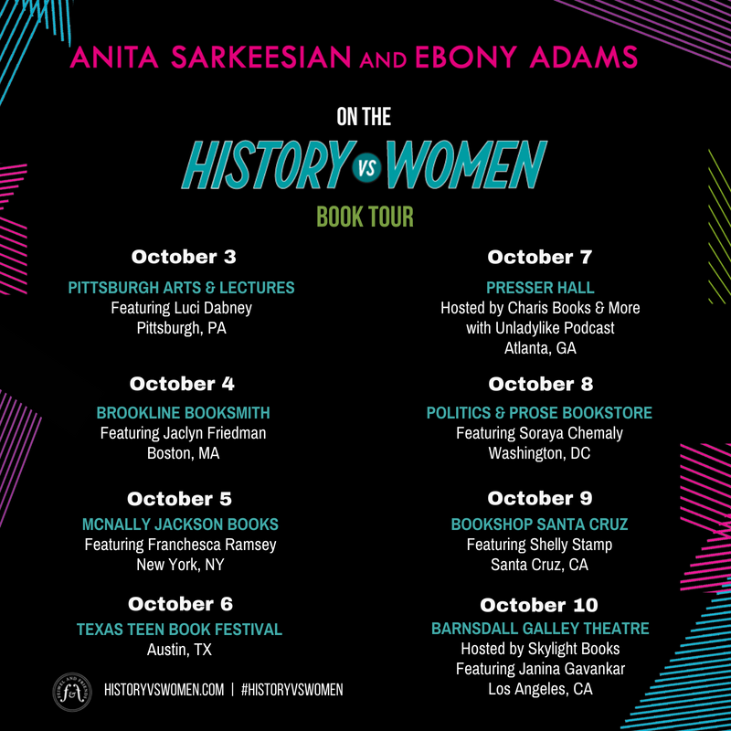 HISTORY VS. WOMEN, the new book by @anitasarkeesian and @ebonyaster, is almost here, and guess what? They're going on tour! Come out and see them if they're coming to a city near you. Visit http://historyvswomen.com  for more info and to preorder your copy today!pic.twitter.com/jBv21PmV1I