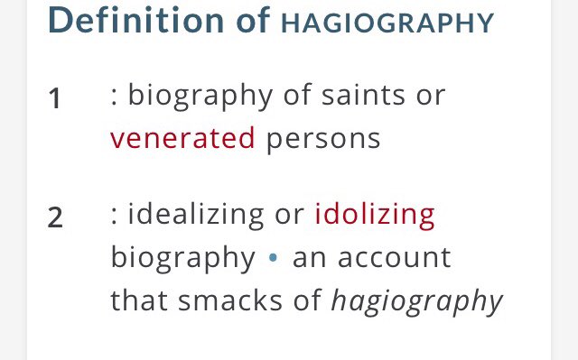Alright then fine, and I can't believe I have to say this but Wiki articles shouldn't be where you're pointing to. And maybe you should read past the first sentence. I'm still using the word in a correct manner. https://www.merriam-webster.com/dictionary/hagiography …https://www.merriam-webster.com/dictionary/historiography …