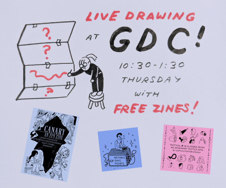 Hey! I'll (briefly) be at GDC! I'll be 1 of 4 artists (+@hellophia,@anitatung, &@yoshisquared) participating in a live drawing event. I'll be there Thurs 2:30-5:30pm in the Visual Arts Community Space on the Expo Floor in Center Hall, btwn North & South Hall Expo floors.