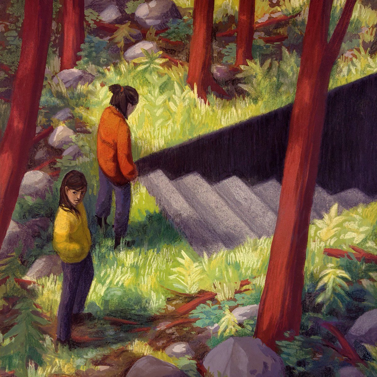 Friends find a staircase in the woods, gouache and colored pencil.