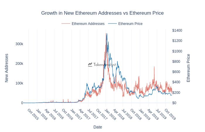 We were playing around with our API and plotted new ETH addresses by day (incl. smart contracts) vs price. This very interesting graph emerged